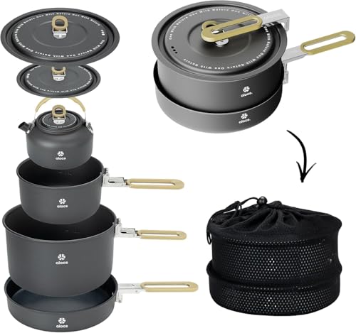 Alocs Camping Kochgeschirr, tragbares Antihaft-Campingpfannen-Set mit verbessertem Griff, ideal für Outdoor-Küche, Picknick, Wandern und Angeln