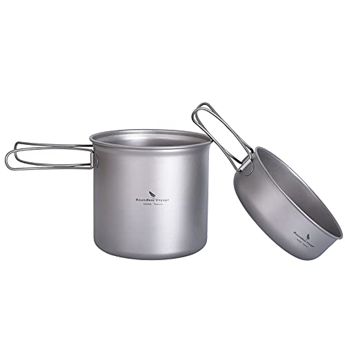 iBasingo 500ml+1500ml Camping Topf & Pfannen Set Titan Kochgeschirr Set mit Klappgriff Outdoor Leichte Kochutensilien Wandern Tragbare Schüssel Tasse Küchenutensilien Reise Picknick Geschirr Ti2051C