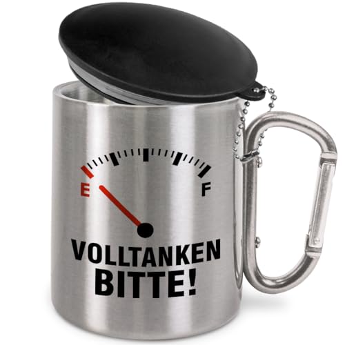 Der Edelstahl-Trinkbecher mit Karabinerhaken und Deckel von Prozente Momente ist die idealische Geschenkidee für alle, die gerne unterwegs sind. Mit seinem robusten Edelstahl-Gehäuse und doppelwandiger Isolierung ist er perfekt für Outdoor-Aktivitäten wie Camping oder Besuche bei Vereinen geeignet.