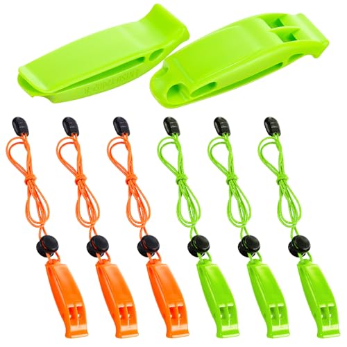 Sie erhalten 6 Sicherheitspfeifen mit verstellbaren reflektierenden Lanyards, ausreichende Menge, leuchtende Farben, Orange und Grün, leicht zu identifizieren, geeignet für den persönlichen, familiären und Teamgebrauch.
