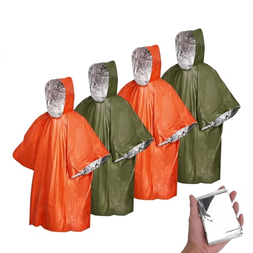 ZRUEWOT 4 Stück Notfall Poncho Regenponcho mit 1 Stück Rettungsdeck, Biwaksack HäLt Sie Warm und Trocken, Notfall AusrüStung Geeignet für Camping, Wandern und NotfäLle (Orange/Grün)